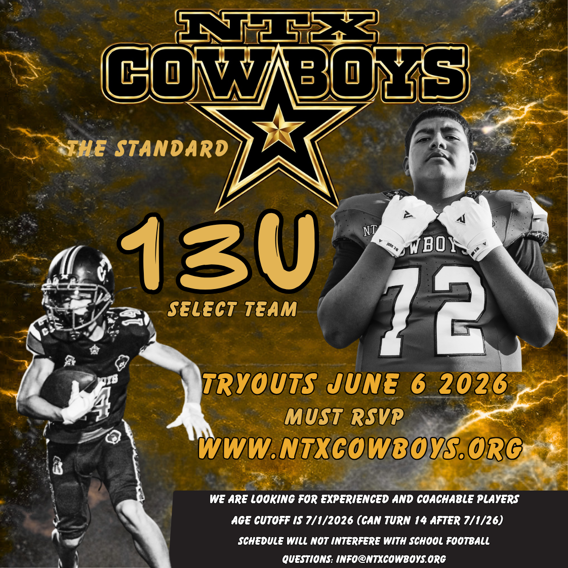 *Tryouts will be held on June 6, 2026 from 10am-12pm at Walker Middle School. (633 French Settlement Rd, Little Elm, TX 75068). Players need to come in padded pants and bring their helmet and shoulder pads. **Registration is required to attend!