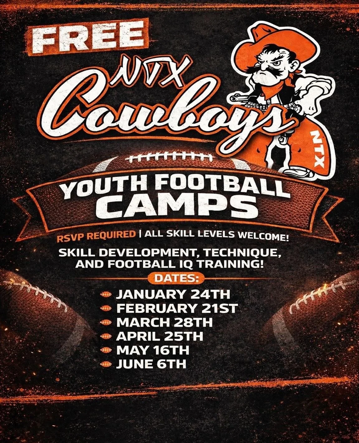 *The FREE football camps are for ages 5u-13u. Please come in shirt, shorts, cleats, and mouthguard.