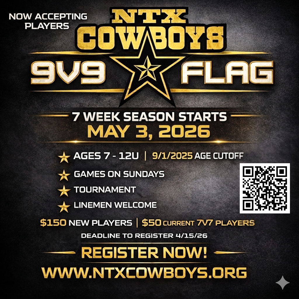 *9v9 football (ages 7u - 12u as of 9/1/25) is $50 for current 7v7 players and $150 for new players. Fee includes a custom uniform, player insurance and 1 tournament.